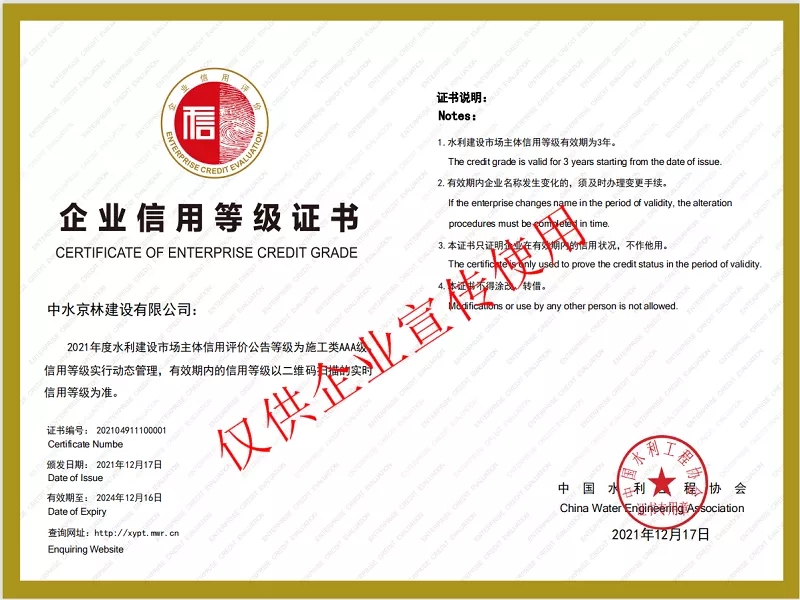 2021年12月17日,中國水利工程協(xié)會公布了2021年度全國水利建設市場主體信用評價結果,我司喜獲AAA信用等級證書。這是繼8月份我司獲得“水利安全生產標準化一級達標單位”榮譽稱號后,又一次得到水利部的褒獎。